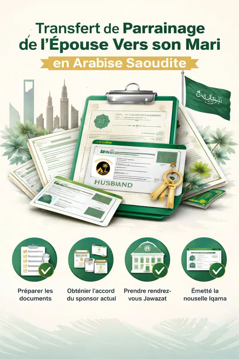 En Arabie saoudite, lorsqu’une épouse possède déjà une Iqama valide mais qu’elle est enregistrée sous un autre sponsor (entreprise, ancien tuteur, ou autre), il est possible d’effectuer un transfert de parrainage afin que le mari devienne son sponsor légal.