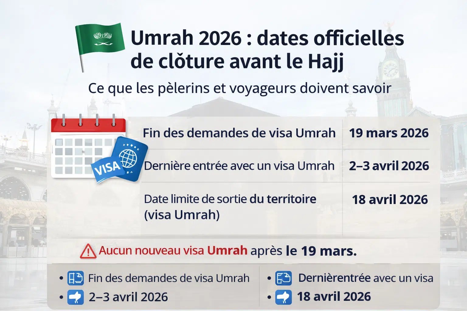 👉 Après le 19 mars 2026, aucun nouveau visa Umrah ne sera délivré.